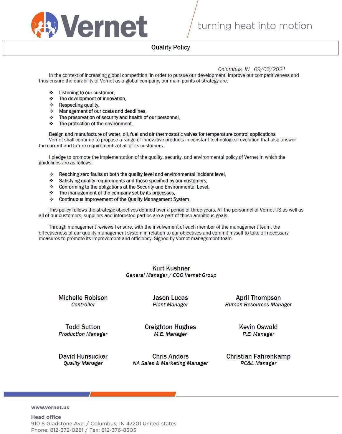 Vernet US quality policy