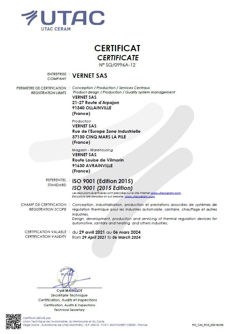 Vernet France ISO 9001