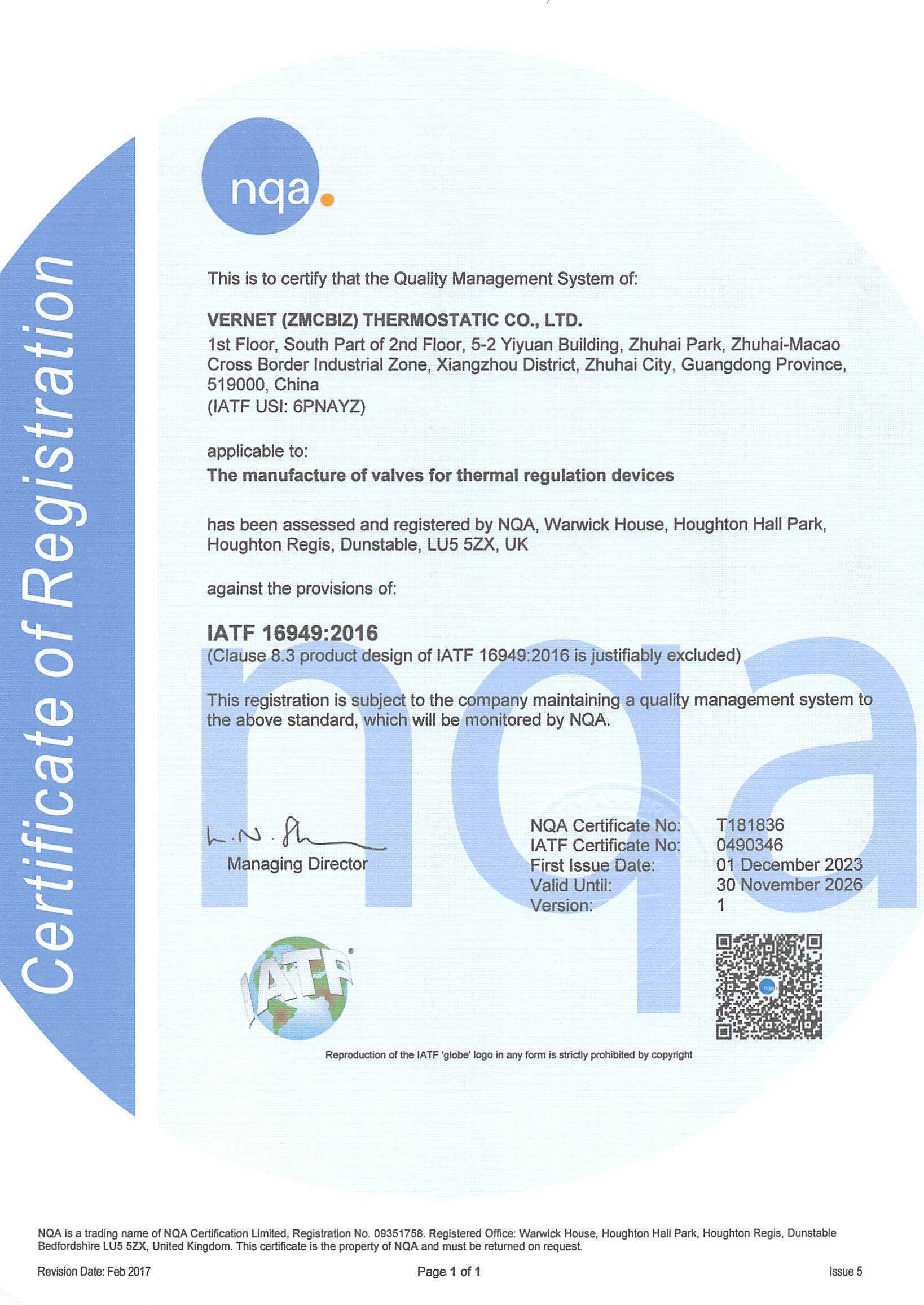 Vernet China – IATF16949:2016