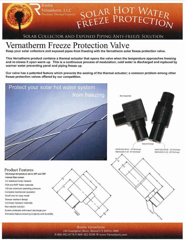 通過使用我們的混合型預凍保護產品,可以同時調節壓力和溫度。 除了準確的熱力執行器外,這些閥門還包含一個壓力釋放組件,它能感應內部壓力,並在超過設定極限時釋放流體壓力。 優點: 避免凍害 使用壽命長 自我操作 排放所需的最低水量 響應速度快 無需外部電源 Vernatherm by Vernet的溫度範圍是現時較大的選擇,可以適應任何溫度範圍。我們的熱膨脹資料混合使我們比競爭對手的標準工作溫度有優勢。當客戶選擇Vernatherm by Vernet的產品時,客戶可以控制他們收到的溫度範圍。 防凍閥 10/12/2019 pdf 1.08 MB 下載檔案
